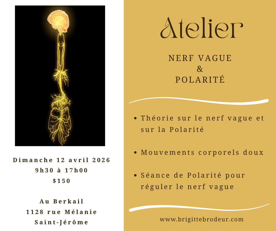 Venez découvrir comment prendre soin de votre nerf vague à travers la Polarité et différents exercices corporels. Cet atelier vous invite à explorer en douceur les liens entre votre équilibre intérieur, la relaxation et le bien-être global, en mettant en lumière le rôle du nerf vague dans la gestion du stress et de la vitalité.